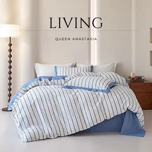 / Striped Duvet Cover Queen 100% Washed Cotton Blue and White