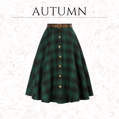 Women’s Plaid Skirt High Waisted A-Line Flared Midi Skirts with Pockets & Belt
